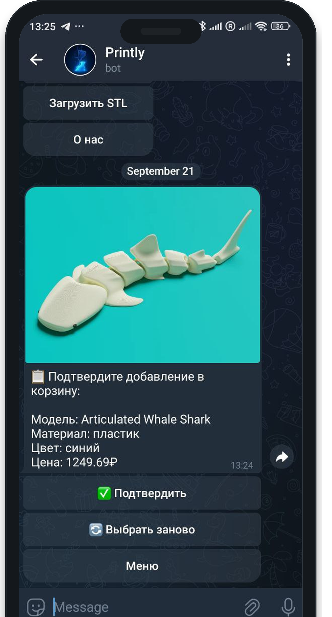 Cервис 3D-печати «под ключ» для B2B и частных клиентов. Печатаем прототипы, мелкие партии и запчасти на FDM и фотополимерных принтерах. Предлагаем: каталог готовых изделий, печать по вашему STL, подбор материала и цвета, быстрый расчёт и оформление заявки за 2 минуты. Всё это в удобном Telegram-боте, пользователь получает прозрачный прайс, сопровождение от идеи до доставки, аккуратную упаковку и гибкие условия. Оперативная доставка по Москве, большой парк 3D принтеров.
